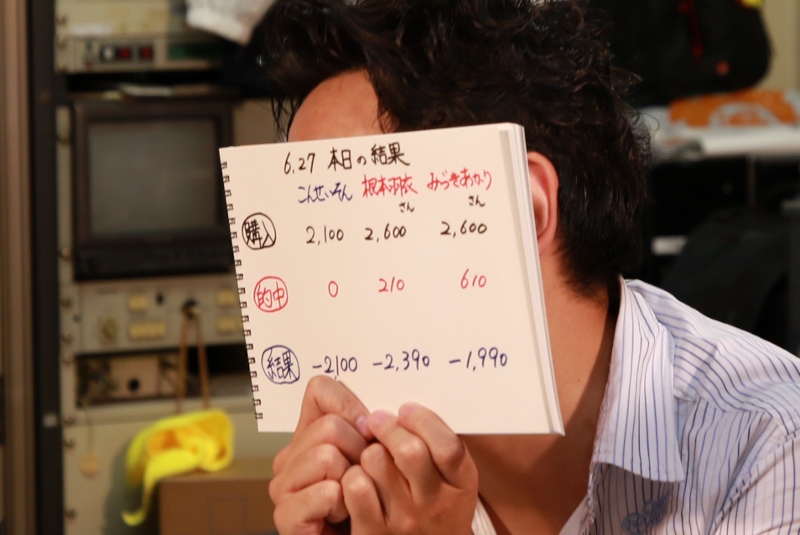 結局こんさん全敗。根本さん1勝、みづきさん1勝。収支は全員マイナスでしたあ(放送内)