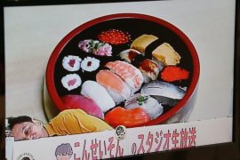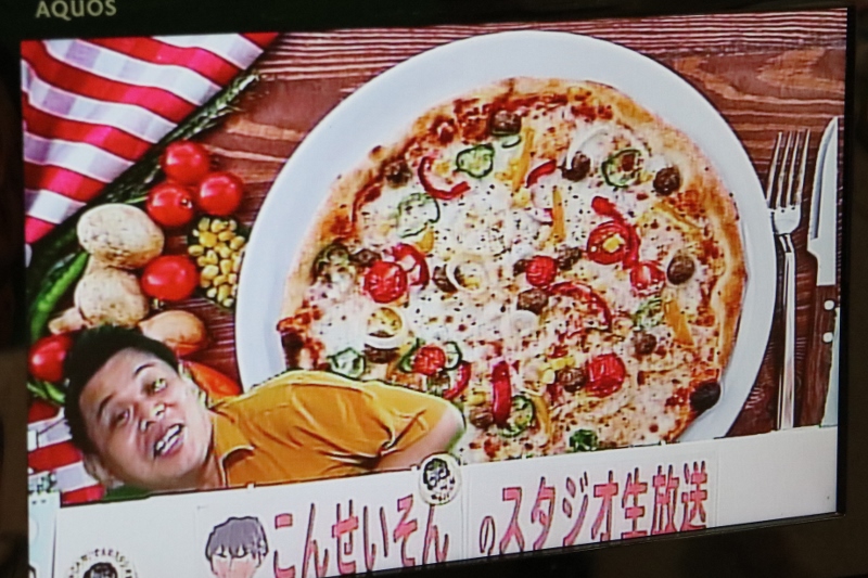 レース終了後はピザとお寿司の背景で我慢ガマンww