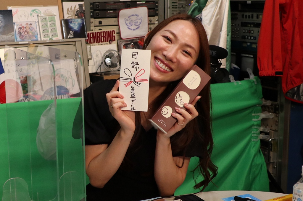 スタッフから6連単的中のご褒美!お菓子と浜松-東京間のグリーン席の目録(手書きw)が!次回のスタジオが楽しみですねえ!いやあおめでとうございます!