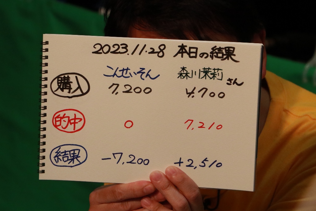 短期決戦なのに初日からマイナス収支。残り3日間でプラス収支にはなるには中穴・大穴狙いになるのか?いや、いつもから中穴狙いのこんせいそんさん、2枚・3枚と厚めに買うやもしれません。