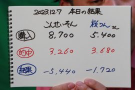 マネージャーさんも的中して一人当たらない桜さんは、絞りきれない「ヒヨり桜りん目」で的中を狙います・・・が、何故か当たらない
