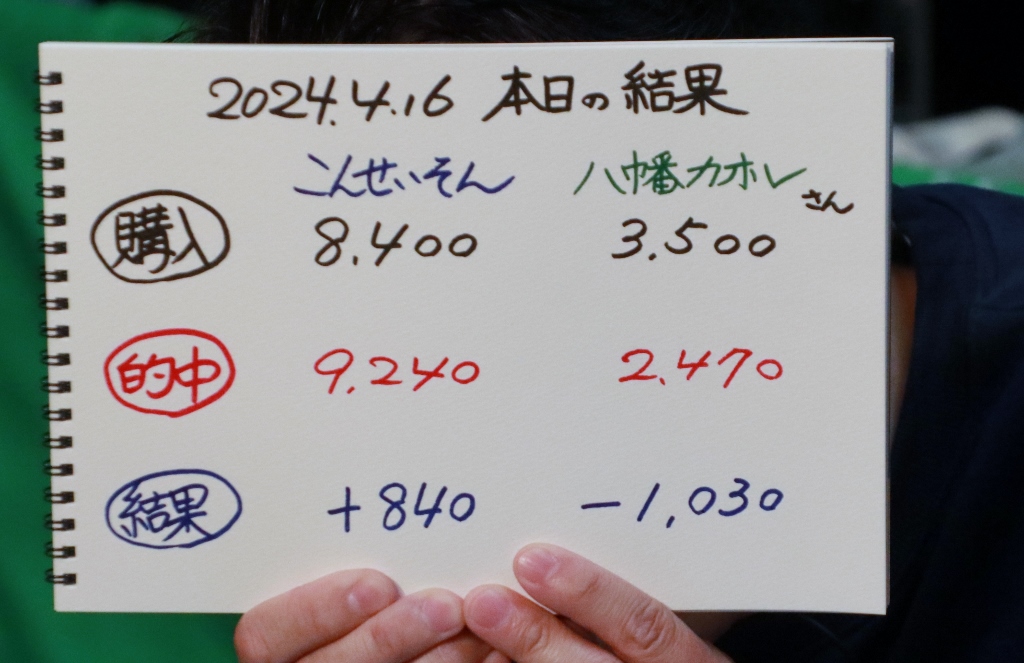前回昨年4月は四埼千恵子さん0勝、ボール・マッカトニーさん0勝、藤田ミコルさん1勝。収支はマイナスでした。八幡さん?勝。