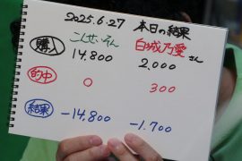 最終レース!的中なるか!?白城さん5枚づつの勝負!でもこんさんの似顔絵付きが不安な・・・