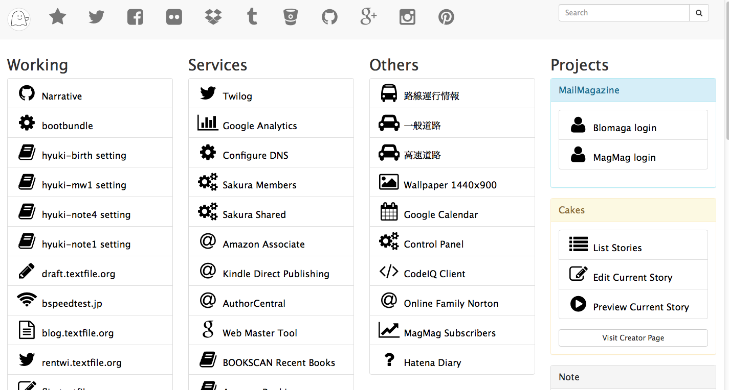 自分だけが使うポータルページなら、いくらでも好きな作りにすることができる。 自分が以前から使っていたポータルページは、HTMLがぐちゃぐちゃになっていて、 見た目も散らかり放題(でもそれなりに便利ではあるが)。 この機会にBootstrapで何か作りたい!という気持ちに便乗して、 ポータルページを作ってみようか……と思っているうちに、 できてしまいました。