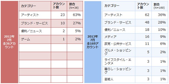 また、63%を占めていた「アーティスト」カテゴリーが36%に減少し、代わりに「ブランド・サービス」カテゴリーから、「グルメ・ショッピング」「ライフスタイル・エンタメ」「暮らし・ショッピング」が派生して割合を増やしています。