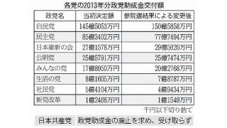 政党助成金 13年最終分支給―年総額9党で318億円