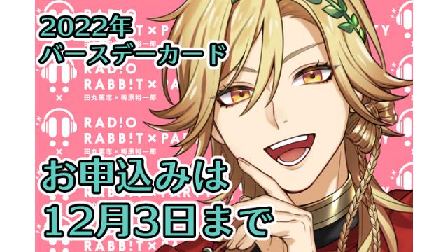 ラビラジを応援してくれるすべてのウサギちゃんへ愛をこめて!!ラジオRABB!T×PARTYからMC 田丸篤志&梅原裕一郎 のメッセージ入り特製オリジナル・バースデーカードをお贈りいたしますご応募いただいた方全員へ2022年のお誕生月にバースデーカードが届きます。ご応募はこちらからhttps://passmarket.yahoo.co.jp/event...