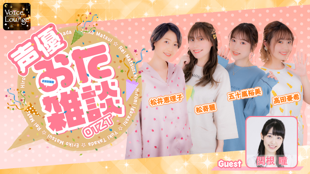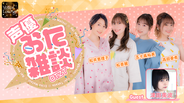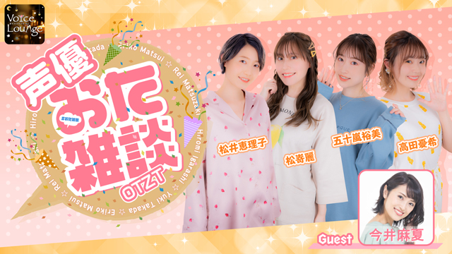 声優の松井恵理子、松嵜麗、五十嵐裕美、高田憂希のMC4人がお送りするおたくトーク番組『声優おた雑談』スタジオに女性声優ゲストを招き、好きなアニメ作品や趣味などについて熱く語り尽くすトークをお届けします。