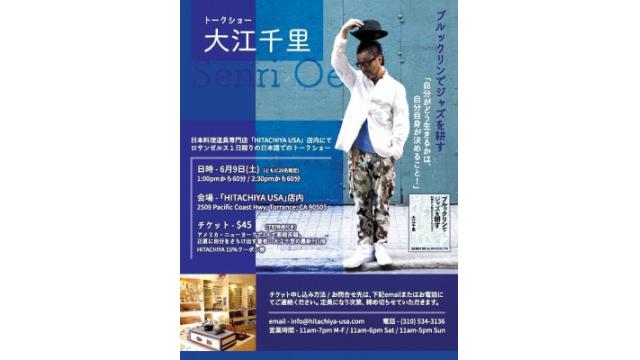 大江千里トークショー :日本料理道具専門店「HITACHIYA USA」店内にて ロサンゼルス1日限りの日本語でのトークショー6月9日(土)1pmから60分/ 2:30pmから60分(各々25名様限定)会場:HITACHIYA USA店内