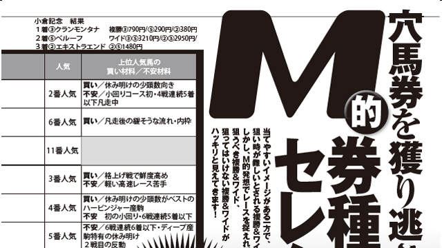 絶賛発売中の競馬王11月号から、『複勝&ワイドで儲けるコツを伝授! 穴馬券を獲り逃がさないM的券種セレクト/今井雅宏』を特別公開しております。