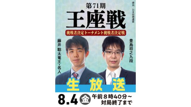 8/4、『第71期王座戦』挑決トーナメント挑戦者決定戦 藤井竜王・名人 vs 豊島九段を生放送!