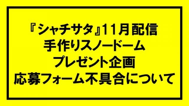 いつもシャチサタをご視聴いただきありがとうございます。「シャチサタ」11月19日の生配信で作成した『メンバー手作り・スノードーム』のプレゼント企画に関して、「応募フォームにいけない」不具合が発生しておりました。ご迷惑をおかけし申し訳ございませんでした。現在は不具合が解消しております。こちらの応募フォ...