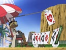 三度笠と服をどこかで落としてきてしまったゾロリ。困っていると運良く川上から洗面器に入った服と帽子と腹巻きが流れてきた。その服に着替えていると、ゾロ...