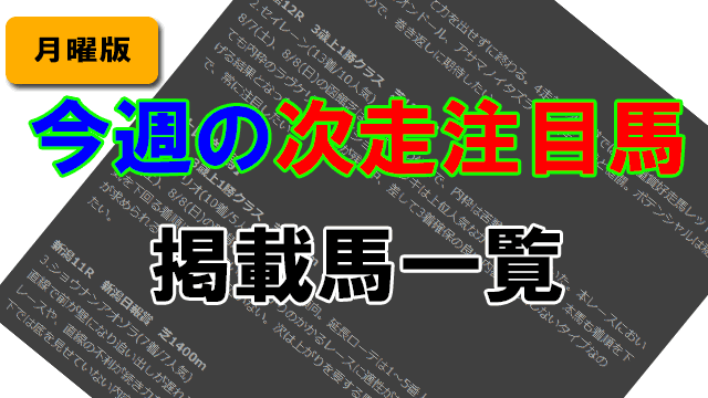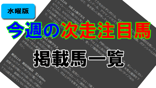 本コーナーは、「次走注目馬」コーナー掲載馬の中から今週の出走馬をまとめた記事となります。