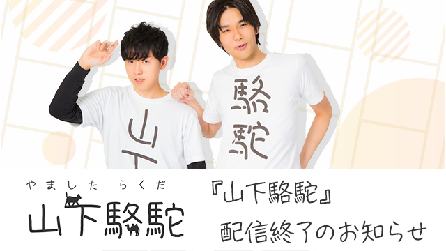 この度は皆さまにご報告となります。先の生配信でもお伝えさせていただきましたが、あくまでもでゆる~く過ごす自然体な声優の山下大輝さんと作家の駱駝さんの二人の姿をお届けするトークバラエティーとして、2021年1月より始まった『山下駱駝』は、来月2022年5月分配信をもって配信を終了することになりました。番組が...