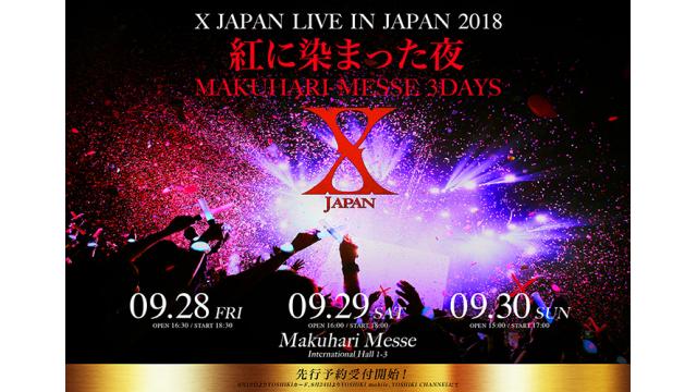「X JAPAN Live 日本公演 2018 〜紅に染まった夜〜Makuhari Messe 3Days」開催決定!8月19日(日)より、YOSHIKIカード会員(VIP,VISA,yoshikitty)先行抽選受付開始!8月24日(金)15時よりYOSHIKI mobile、YOSHIKI CHANNEL先行抽選受付開始!X JAPANが2018年9月28日(金)~30日(日)の3日間、幕張メッセで「X JA...