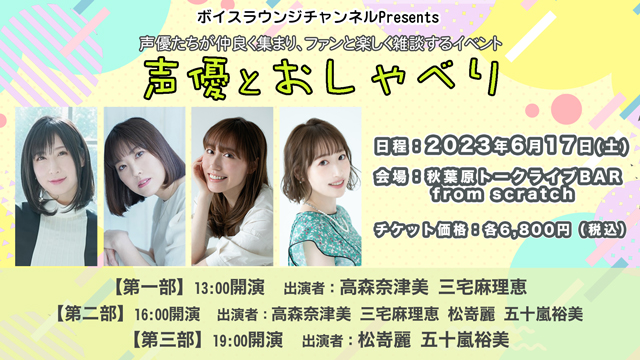 https://voicelounge.zaiko.io/item/357230※一般(非会員)の方は上記URLより配信チケットをご購入ください。※ニコニコボイスラウンジチャンネル会員の方は上記URLからではなく、必ずこのページ最下部の会員用のURLよりチケットをご購入ください。※会員用URLを経由しない場合、チケットが一般価格となってしまいます。配信チケット価格:<各部>一般 各4,500円(税込)/チャンネル会員 各3,900円(税込)※チケット代金のお支払いにはクレジットカード、コンビニ、Paypal、WeChat、Alipayがご利用いただけます。詳しくはこちらをご確認ください。※ライブ配信終了後、アーカイブ配信期間中は何度でも視聴可能です。※ご購入時の「+Archive」のご選択内容により、アーカイブ期間(配信当日から7日間、14日間、30日間)が異なります。+Archiveについてはこちら:https://zaiko.io/faq/customer/premium?cid=83#faq-485※チケットの購入・動画の視聴には電子チケット販売プラットフォームZAIKOへの登録が必要となります。※配信のURLは購入したZAIKOアカウントのみで閲覧可能です。※URLの共有、SNSへ投稿をしてもご本人のZAIKOアカウント以外では閲覧いただけません。※チケットの購入前に、記載の注意事項をよくお読みいただき、配信ライブ視聴に適したインターネット環境・推奨環境をお持ちかどうか必ずご確認ください。※チケット購入後の公演延期・中止以外の理由に伴うキャンセル・変更・払い戻しはできません。※途中から視聴した場合はその時点からのライブ配信となり、巻き戻しての再生はできません。オンデマンド配信、アーカイブ配信中は巻き戻し再生可能です。※インターネット回線やシステム上のトラブルにより、配信映像や音声の乱れ、公演の一時中断・途中終了の可能性がございます。※お客様のインターネット環境、視聴環境に伴う不具合に関しては、主催者は責任を負いかねます。※閲覧に関わるインターネット通信費用はお客様のご負担となります。※データ通信量が多くなることが想定されるため、Wi-Fiのご利用を推奨いたします。※本公演は有料での配信ライブです。一切の権利は主催者が有します。カメラ・スマートフォンなどによる画面録画・撮影・録音は全て禁止いたします。また、動画サイトなどへの無断転載・共有を行った場合、法的責任に問われる場合がございます。※ドメイン指定受信ご利用の方は、「zaiko.io」「zaikomail.com」のドメインを受信できるよう設定してください。※アーカイブ配信期間中は何度でも視聴可能です。